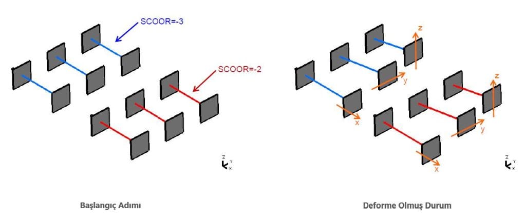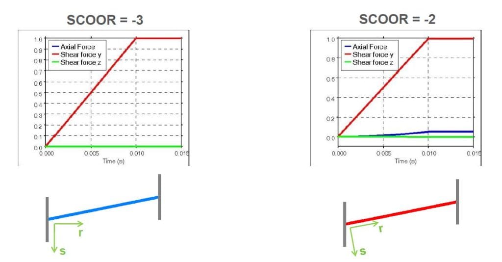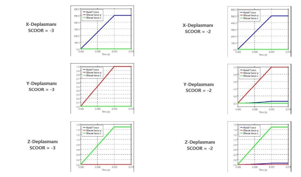 Y ve Z kesme yüklemesi durumunda, kiriş “SCOOR = -3” seçeneği ile herhangi bir eksenel kuvvet oluşmadan dönerken “SCOOR = -2” ile bir eksenel kuvvet oluştuğu gözlemlenebilir.